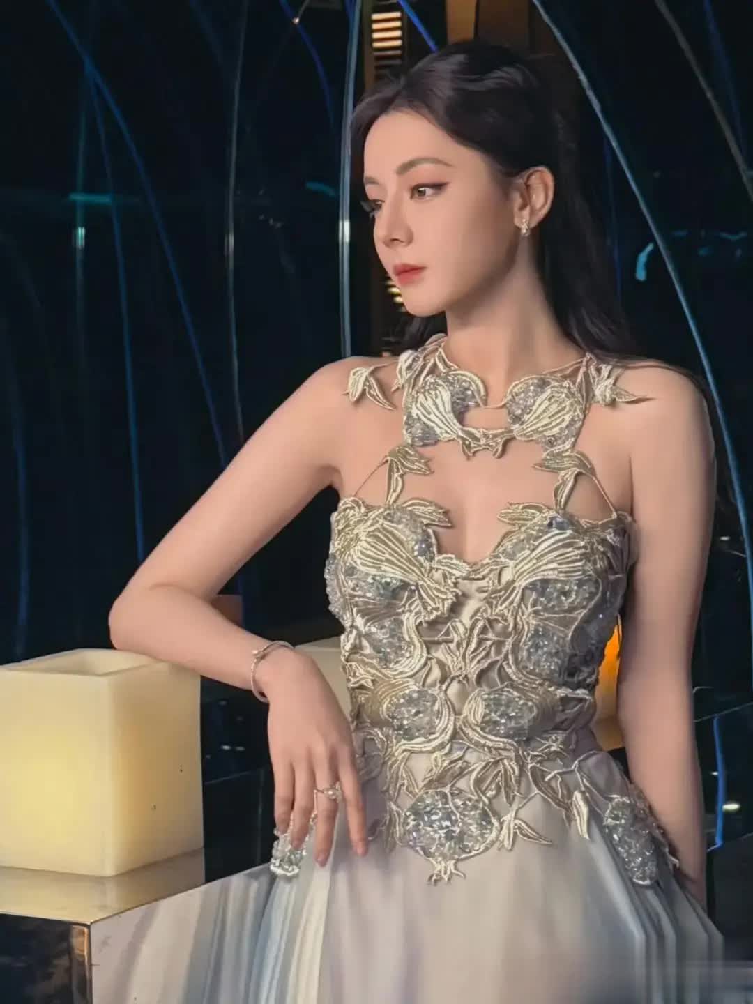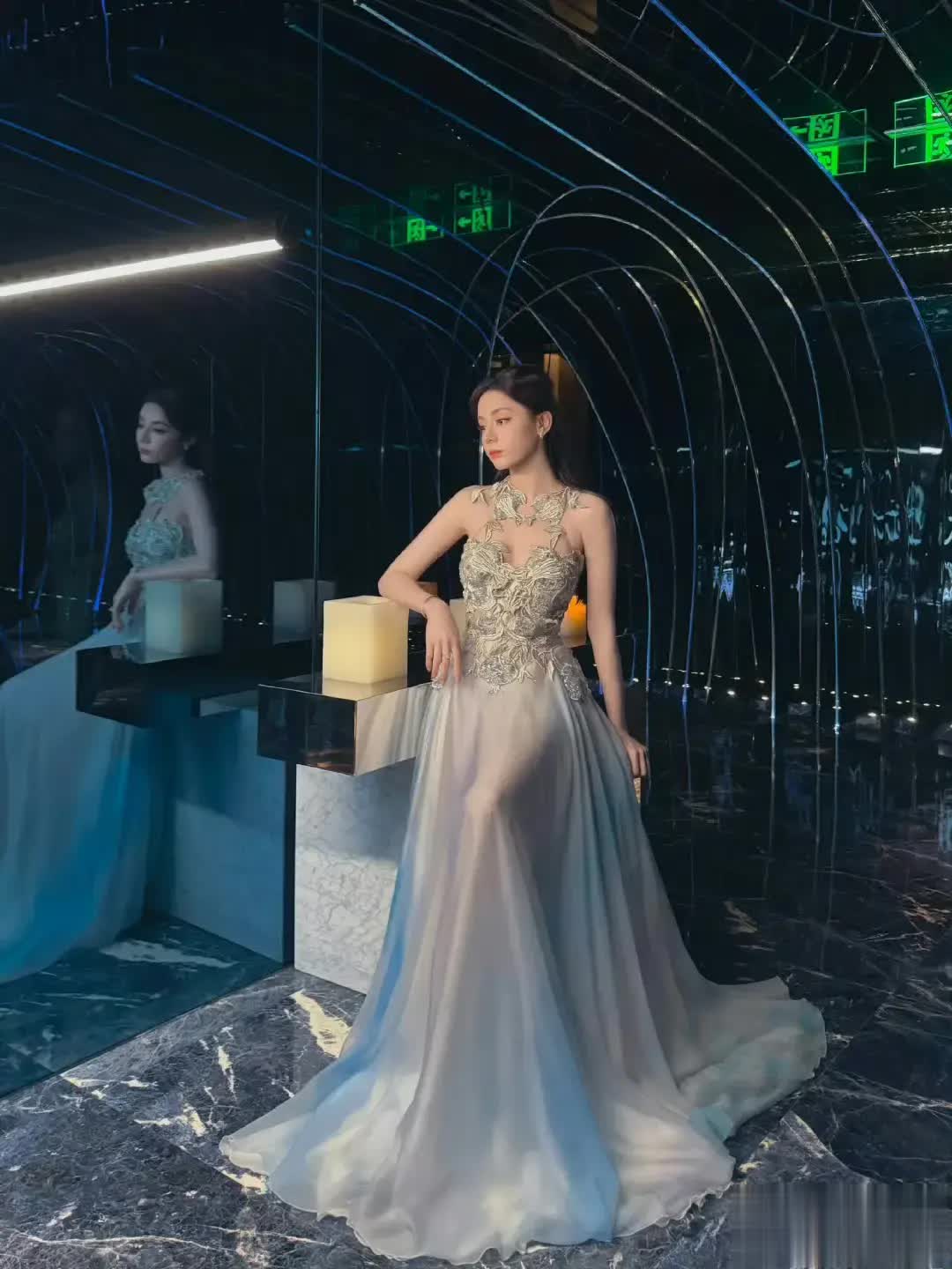 活动当天,热巴以低盘发髻亮相,干净利落的发型完整展露出她优越的肩颈线条与立体骨相。她所穿着的这袭高定礼服上身采用贴身剪裁搭配深V领与侧腰透肤设计,在性感与优雅之间拿捏得恰到好处;下身渐变蓝纱裙摆轻盈飘逸,随江风轻轻拂动。现场生图曝光后,光影透过镂空纹路洒落在肌肤之上,恍若“星河织入衣料”,每一帧都如同电影画面,美得令人窒息。