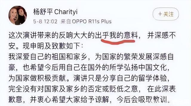 真相与谎言的对比,如此鲜明。 美国梦碎,何去何从? 舆论曝光后,杨舒平遭到了国内一众网友的斥责和辱骂, 或许是因为觉得惹了众怒。 她随即在社交平台发布了一条道歉的博文,但网友们并不买账,纷纷指责她明明是借着公费留学的名额才出的国。 怎么会短短时间就完全变了副模样 ,吃惊不忘挖井人,这简直就是忘恩负义!