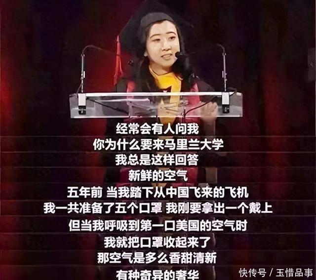 2017年,一中国留学生在美国马里兰大学毕业典礼上的演讲,掀起了一场席卷全网的风波。 她声称美国的空气“香甜清新”, 而家乡昆明的空气“出门必须戴口何方罩”,这番言论瞬间点燃了舆论的烈火。 不愧是崇洋媚外的“开山鼻祖”,为狂舔美国,追寻理想中的美国梦,不惜诋毁自己的祖国。 如今八年过去,曾经的“空气香甜女”下场凄凉, 惨遭美国驱逐,只能狼狈跑回国内。