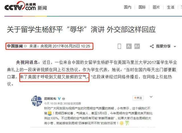 而她之所以引爆舆论,不仅是因为对事实的扭曲,更因为她代表了一类人——他们以贬低祖国为代价,试图换取西方的认同。 在毕业演讲中, 杨舒平将美国空气形容为“香甜而奢华”, 并声称在中国“不戴口罩就会生病”。 然而,昆明素有“春城”之称,空气质量常年位居全国前列。 她的言论迅速被网友打脸: 昆明市民晒出蓝天白云的照片,气象数据证明她的描述纯属捏造。