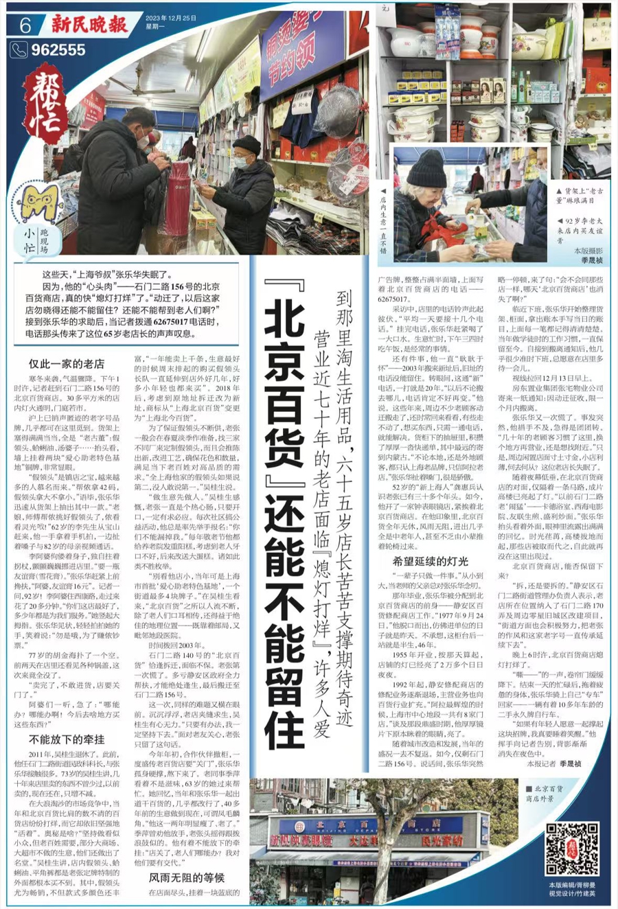 这封来信,把记忆拉回到2023年冬天。当时,本报连续报道了营业近70年的北京百货商店因地块旧改面临“熄灯打烊”,牵动了整座城市的心。无数市民赶在歇业前涌向石门二路,挤进那间30多平方米的小店,只想把老上海的温暖多留一会儿。