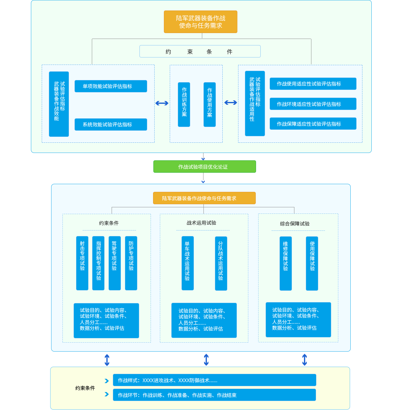 作戰(zhàn)試驗主要依據(jù)裝備作戰(zhàn)使命任務(wù),在近似實戰(zhàn)條件下,按照作戰(zhàn)流程,對裝備作戰(zhàn)效能、保障效能、部隊適用性、作戰(zhàn)任務(wù)滿足度以及質(zhì)量穩(wěn)定性等進行考核與評估,主要依托陸軍試驗訓(xùn)練基地、作戰(zhàn)部隊、軍事院校、科研院所等聯(lián)合實施。